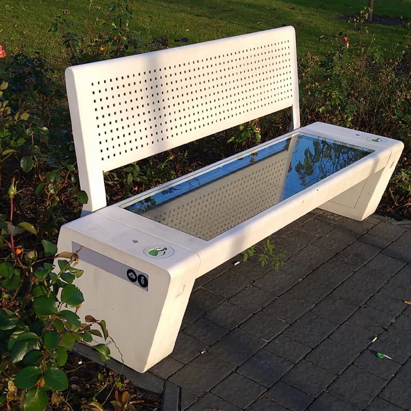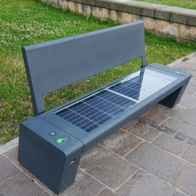 Современная уличная скамья из нержавеющей стали на солнечной батарее для умного города. Минималистичный дизайн и прочная влагозащищённая конструкция делают её универсальным решением для парков, внутренних дворов и коммерческих зон. Оснащена функцией Bluetooth для зарядки или воспроизведения аудио.