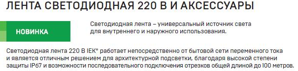 Лента светодиодная 220В IEK - это универсальный источник света для внутреннего и наружного использования. Светодиодная лента работает непосредственно от бытовой сети переменного тока напряжением 220В. Благодаря высокой степени защиты (IP67) и возможности последовательного подключения отрезков общей длиной до 100 метров светодиодная лента 220В IEK является отличным решением для архитектурной подсветки.