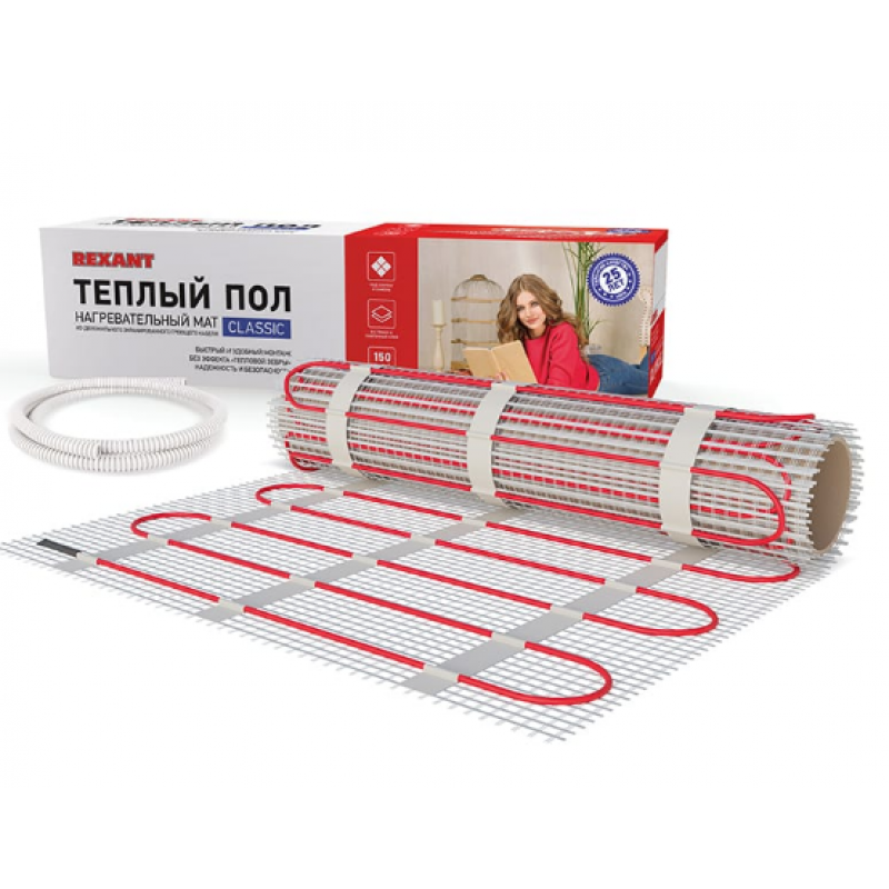Нагревательные маты REXANT Classic с поверхностной мощностью тепловыделения 150 Вт/м2 изготовлены из тонкого двухжильного нагревательного кабеля и применяются в системах «Теплый пол» для комфортного подогрева помещений с покрытием пола из керамической плитки или другого аналогичного материала.